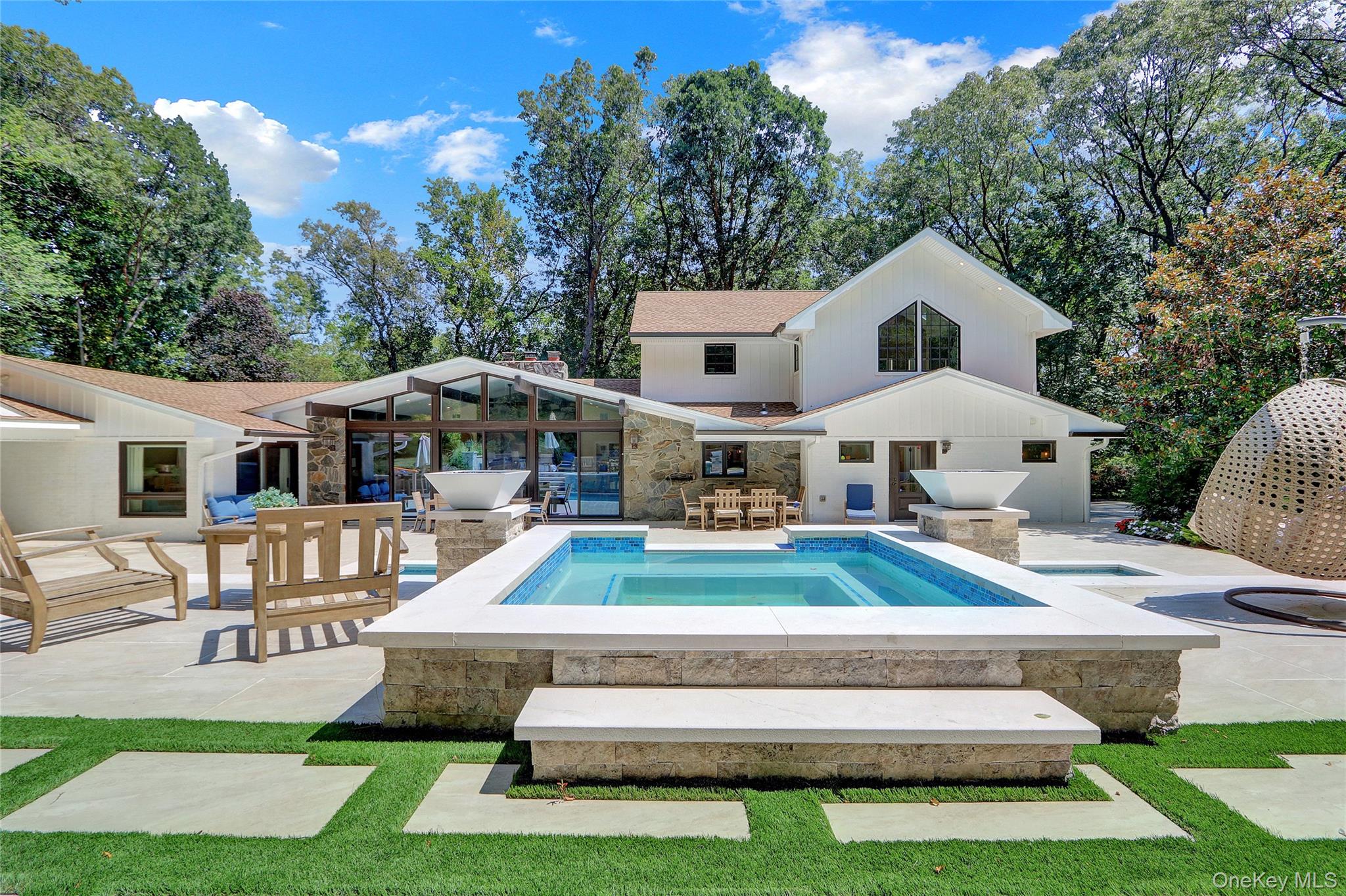 Welcome to Tree Tops--an expansive, newly renovated and expanded California-style luxury ranch set on three serene acres in the heart of Mill Neck. Spanning nearly 7,000 square feet, this six-bedroom, six-and-a-half-bath turnkey residence was fully reimagined in 2024 to the highest standards of luxury living, blending refined design with every modern amenity. Inside, soaring ceilings and oversized picture windows flood the home with natural light, creating a seamless connection to the outdoors. The open floor plan flows effortlessly into spacious gathering spaces, including a sunken living room, a state-of-the-art chef's kitchen, and a dramatic great room with vaulted, beamed ceilings, a stone fireplace, and a wall of glass overlooking the spectacular pool and grounds. Spa-inspired bathrooms and two separate primary suites provide indulgent comfort and flexibility for a variety of lifestyles. The fully finished lower level offers yet another dimension: a complete living area with its own kitchenette, lounge, bedrooms, one-and-a-half baths, private entrance, and dedicated parking. Perfect for multi-generational living, extended stays, or staff accommodations, this space offers independence without compromise. Outdoors, no detail has been spared in the extraordinary $1,000,000 pool and pavilion renovation. A heated gunite pool with electric cover, cascading spa, fountains, fire features, and a 3,000-sf sandblasted Italian marble patio set the stage for unforgettable weekends. The covered outdoor chef's kitchen--complete with bar, pizza oven, BBQ, refrigerator, and sink--makes entertaining effortless in every season. Additional highlights include radiant heat, all-new AC systems, a home theater, EV charging station, advanced security system, professional landscaping and dual driveways for both convenience and grandeur. Tree Tops is a rare Mill Neck offering--crafted for those seeking a year-round sanctuary, a weekend retreat, or a residence designed to adapt gracefully to every stage of life.